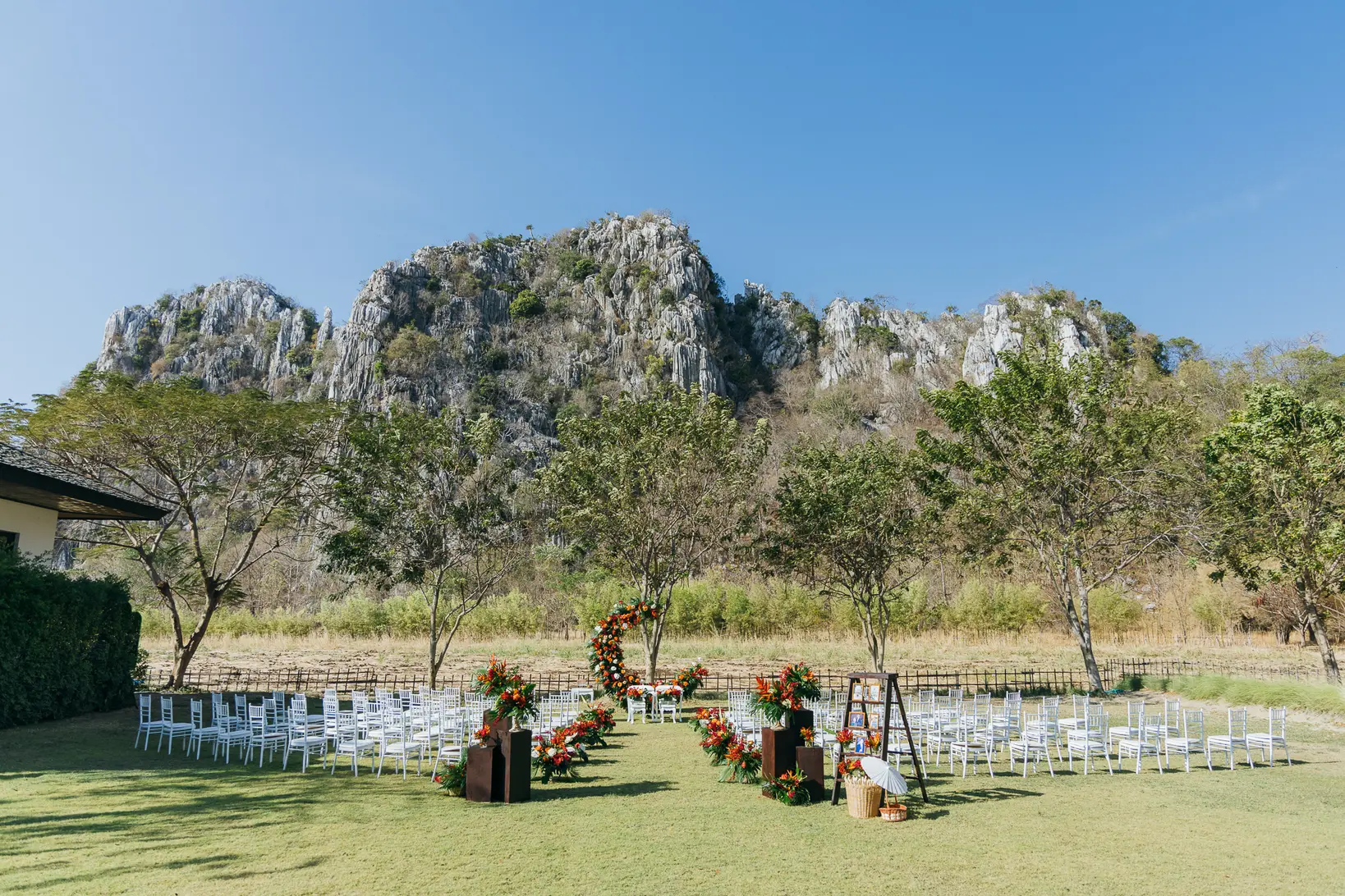 Color hit first. Bold, unapologetic, everywhere. Heather and Nelson didn’t hold back, and the result felt joyful from the moment guests arrived. Lush florals framed the day, tropical in spirit even in Saraburi, with an energy that stayed high long after the ceremony ended.
